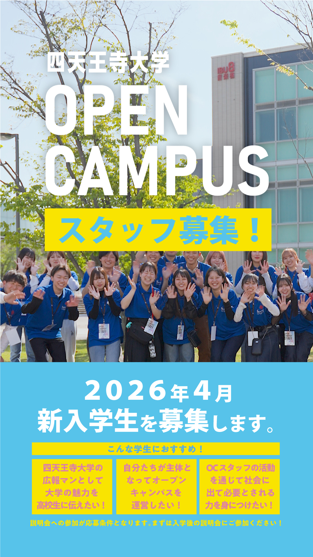 四天王寺大学 OC(オープンキャンパス)スタッフ募集 クラブ・サークル・その他団体 2025.12.20 四天王寺大学では、OC(オープンキャンパス)スタッフとしてオープンキャンパスを企画・運営してくれる学生のみなさんを募集します!OCスタッフに興味がある方は、入学後の説明会にご参加ください。※説明会の日程など、詳細は決まり次第、新入生歓迎イベントやUNIPASS等で告知します。